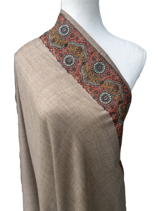 Beige Pashmina Shawl with Kashmiri Embroidered Border