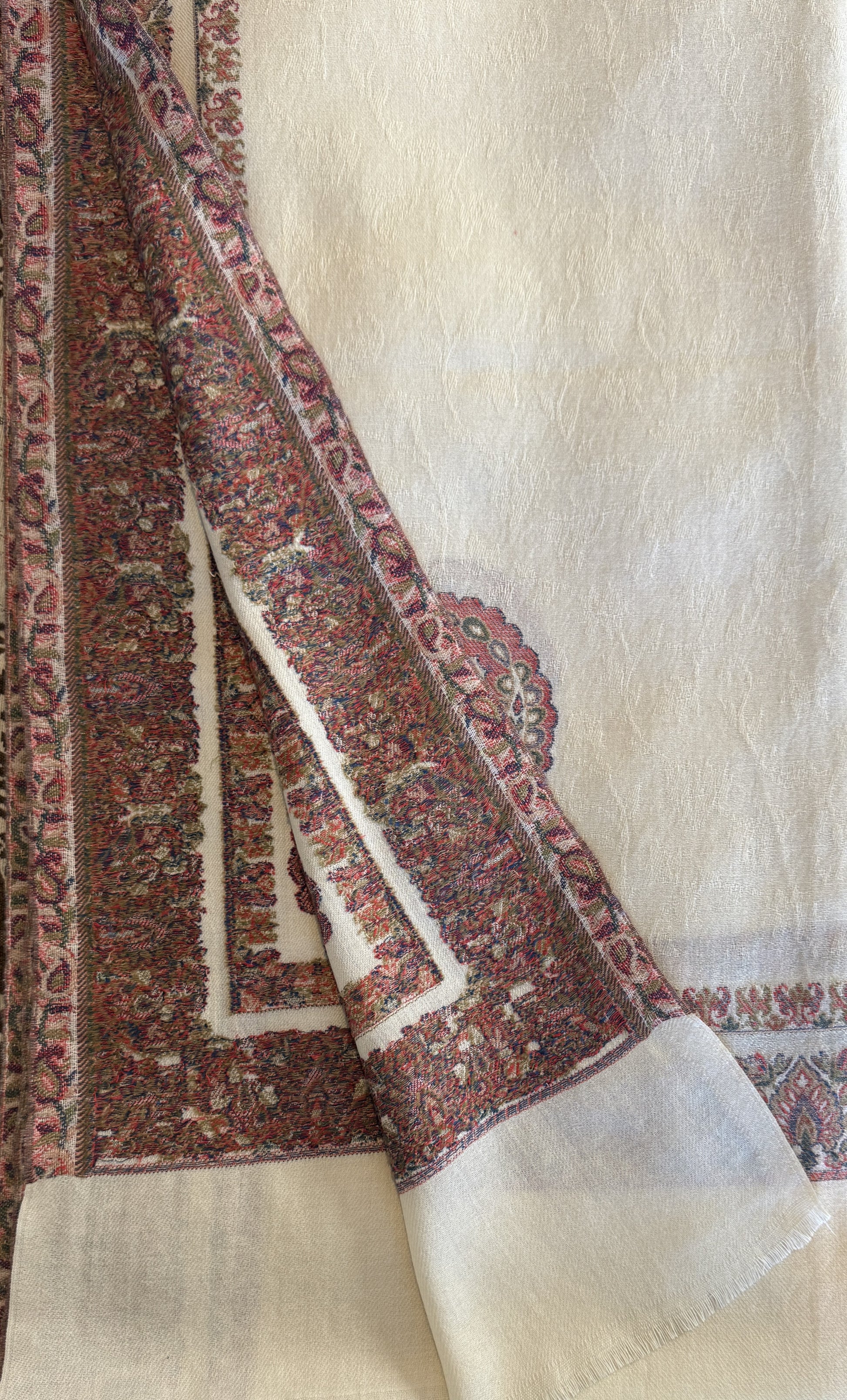 Introducing the SlefPrint Kani Border Shawl, crafted with luxurious pashmina fabric in a creamy hue. Its unique kani border design adds a touch of elegance to any outfit. Handmade in Kashmir, this shawl is lightweight and incredibly soft, making it the perfect addition to your wardrobe.
